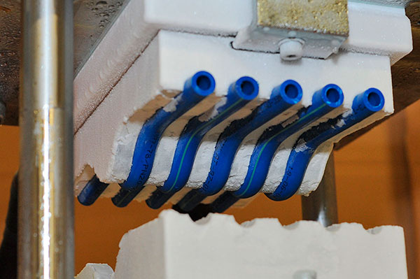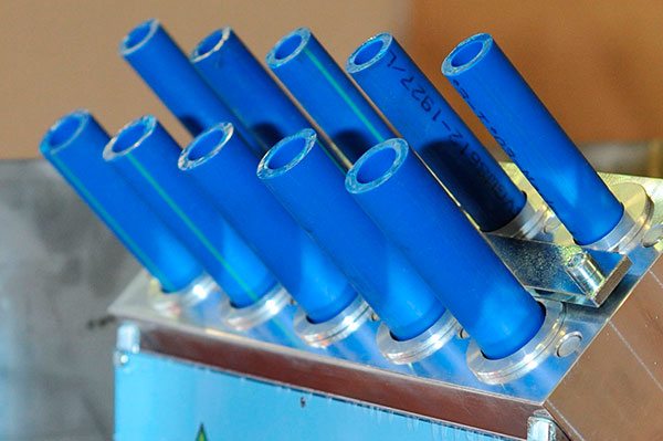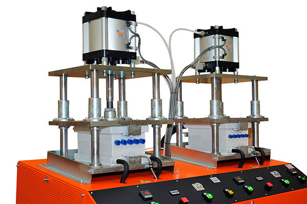 Пневматическая машина S02 для специальной арматуры под названием «обгон». Рабочий диапазон: Ø 20 ÷ 32 мм, резак с баком для сбора кусков, скамья с двумя сборочными постами.